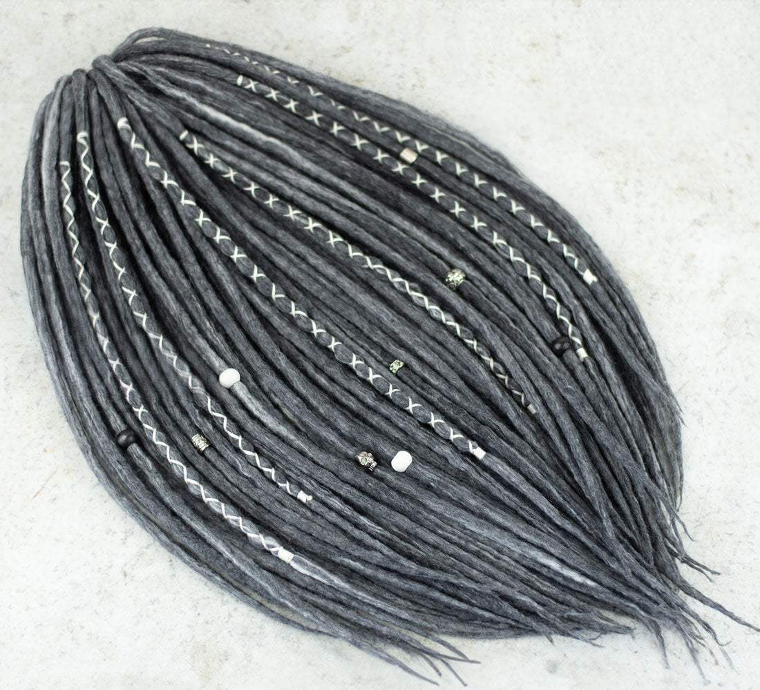 Hide your grey hairs! Mix a few locks of Monochrome wool dreadlocks with your current dread set! Or be yourself and braid a full set with this beautiful grey hair extension.