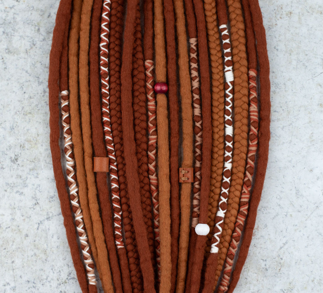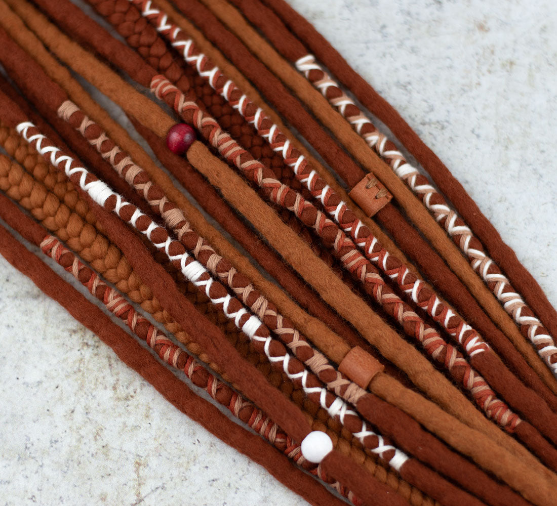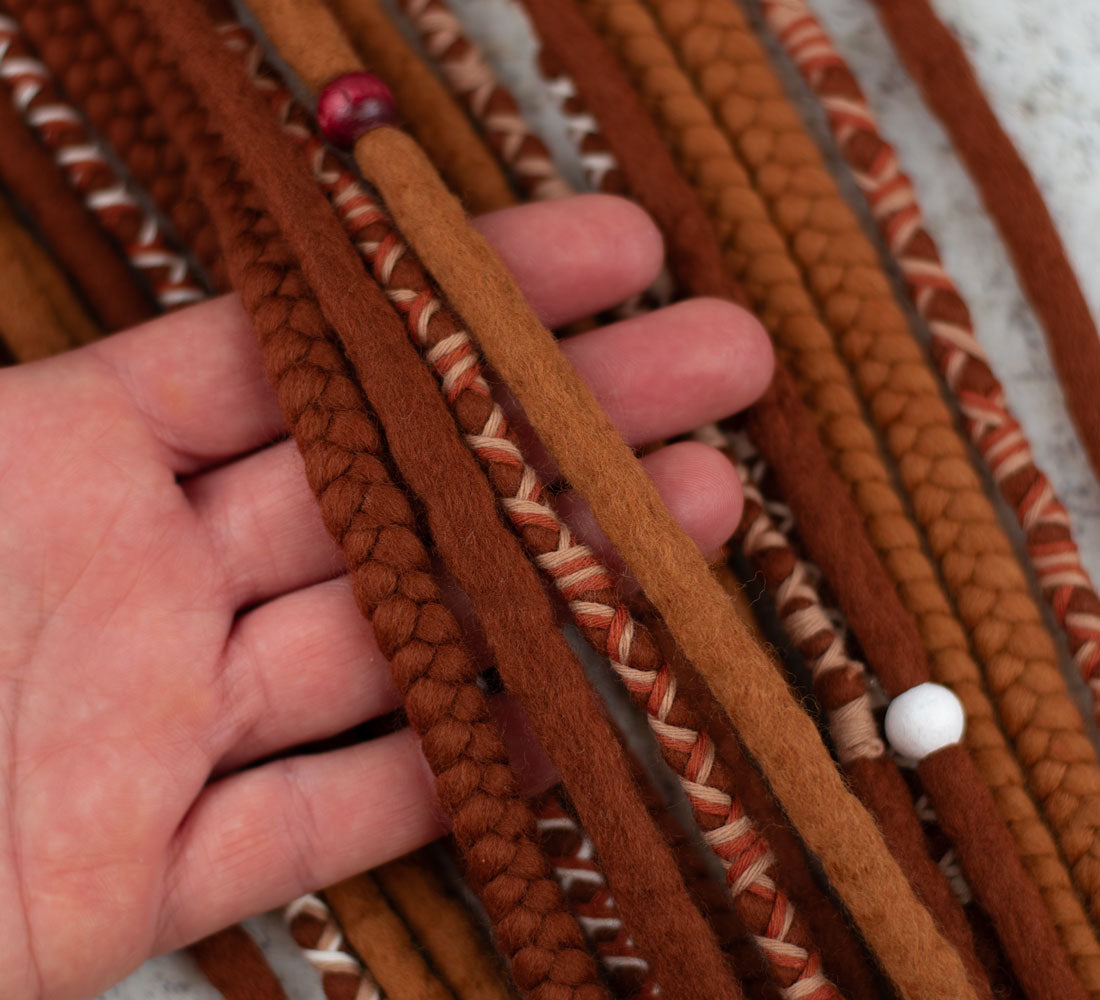 • 10 double ended wool dreadlocks with braids and x-decorated locks